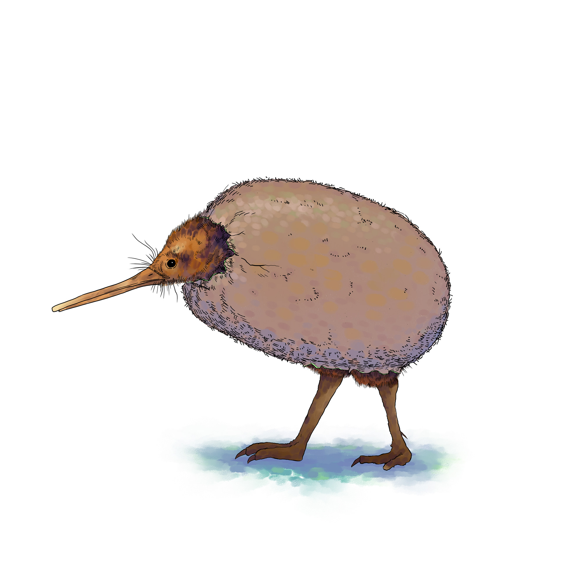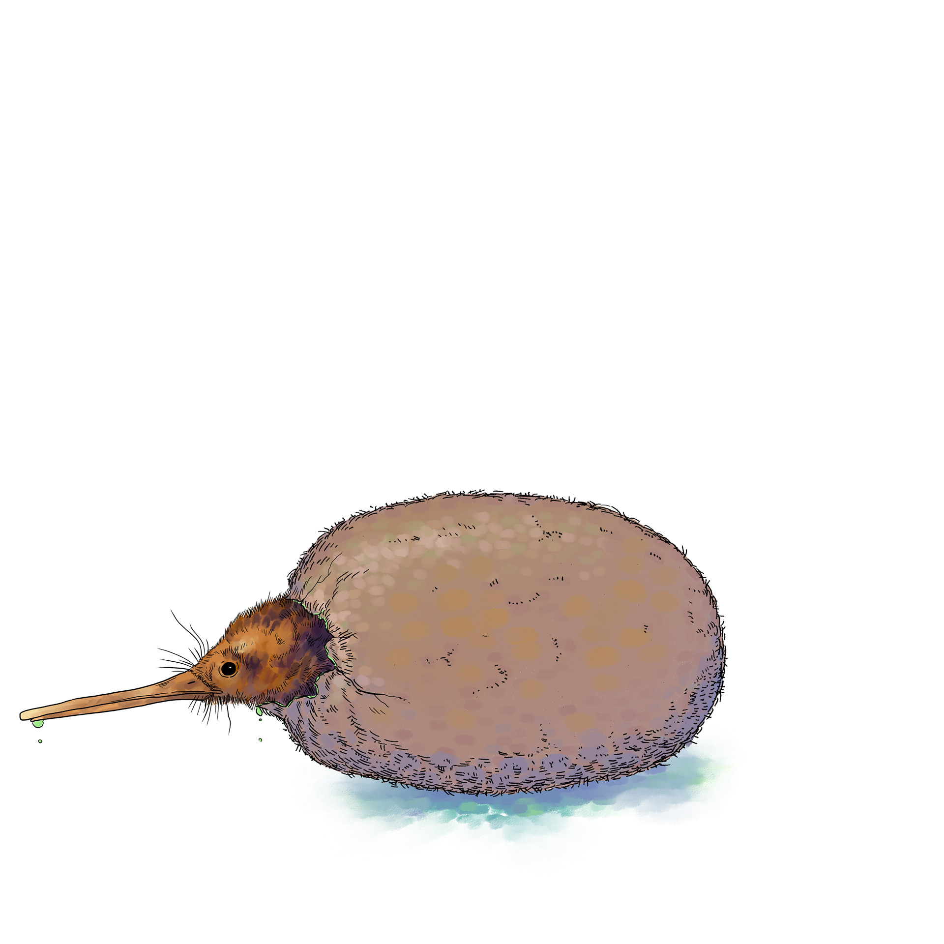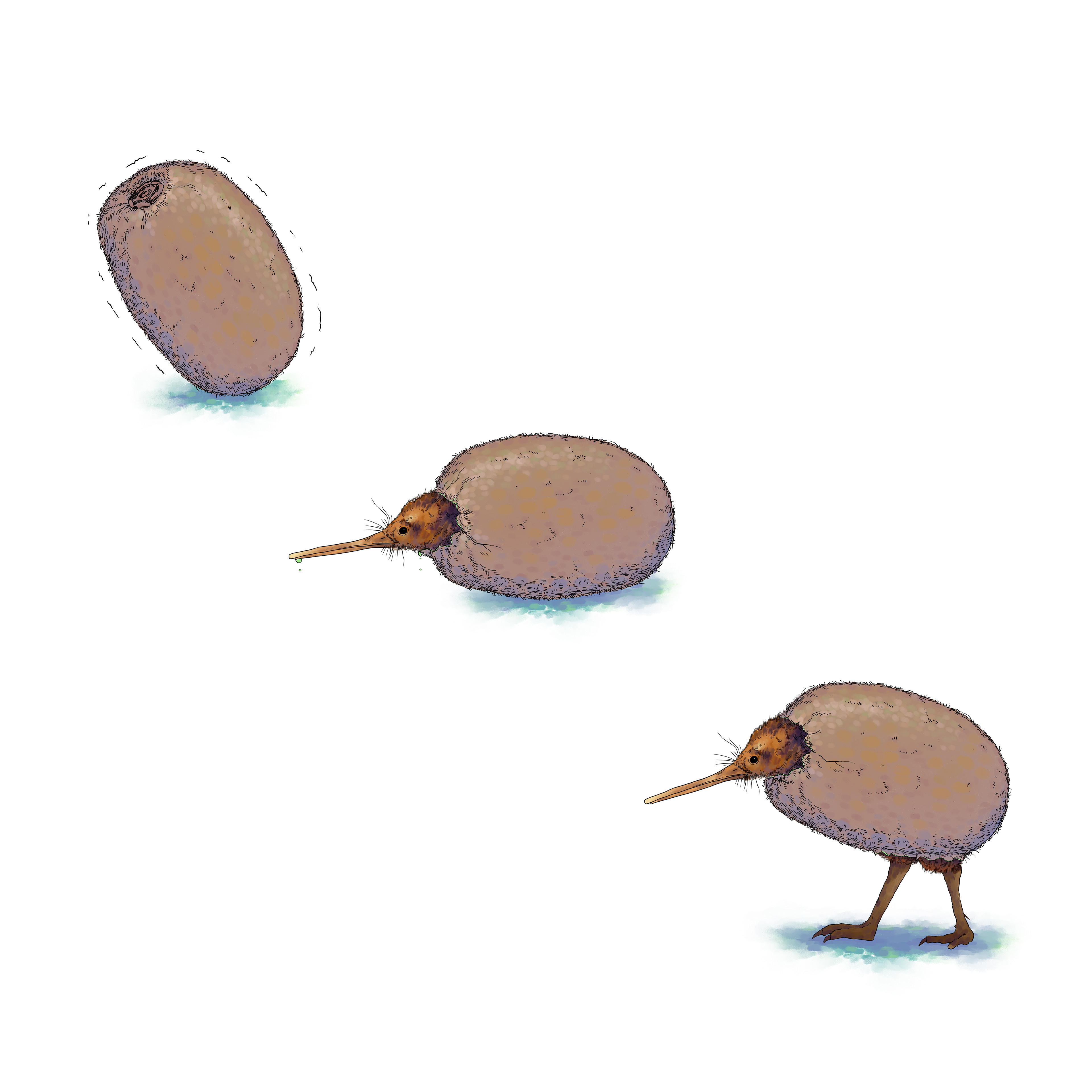 Kiwi bird hatches out of a kiwi fruit.
