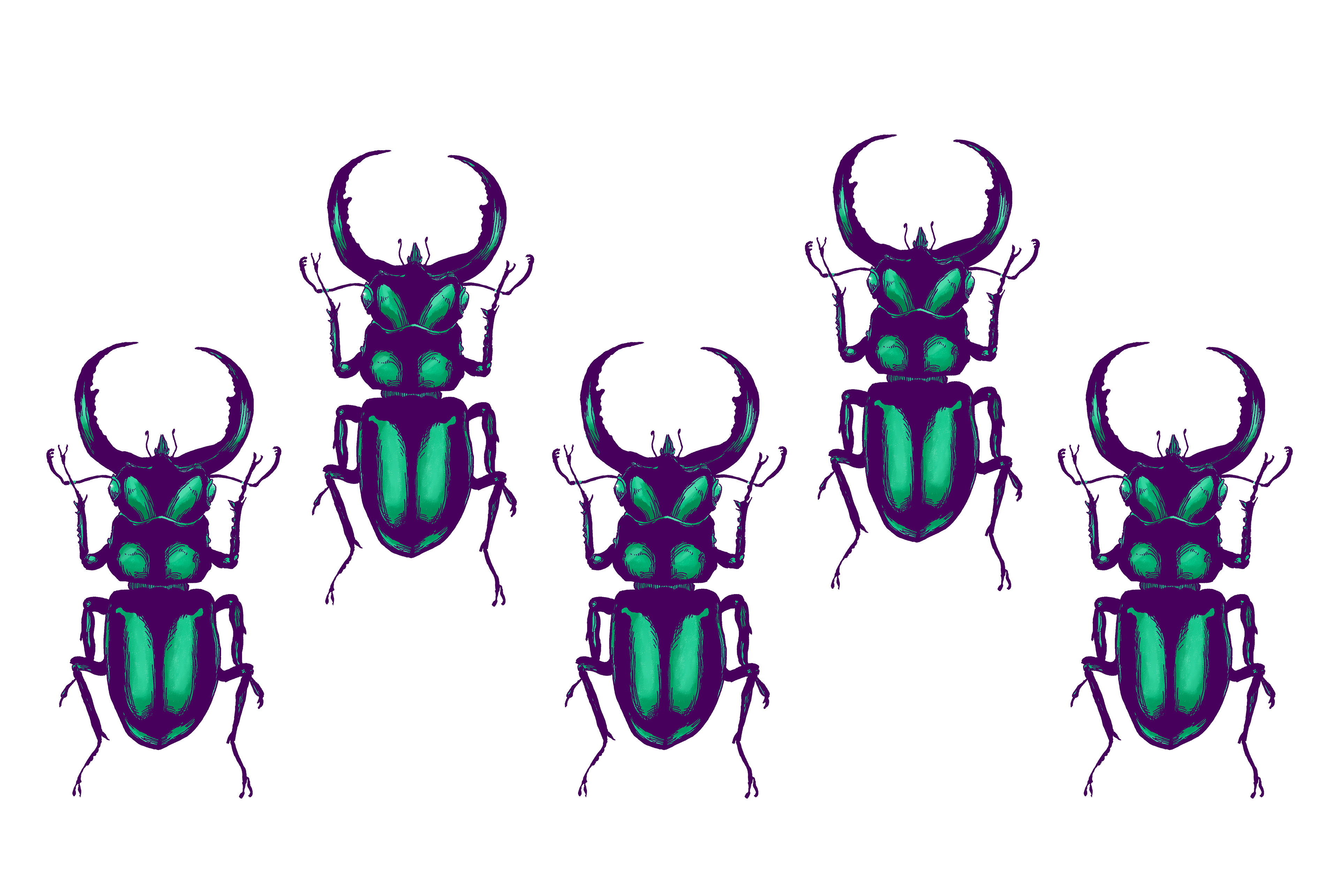 A small collection of inked illustrations with simplistic color contrasts.